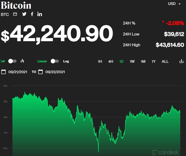 Стоимость самой популярной криптовалюты в мире биткоина утром в среду, 22 сентября, впервые с августа упала ниже отметки в $40 тысяч (-3,2%). Об этом свидетельствуют данные биржи CoinDesk.